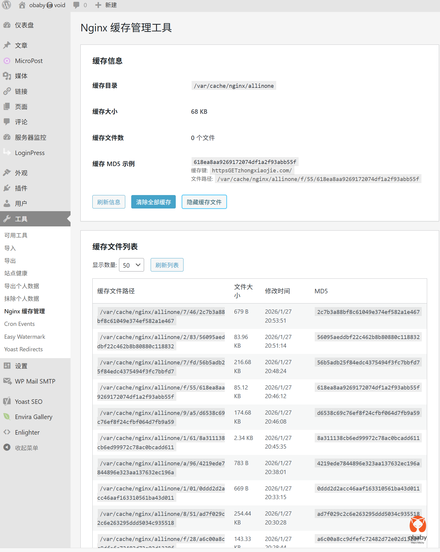 然而,这个东西存在问题,那就是我有多个域名,在数据更新之后怎么同时更新所有域名的缓存数据就成了问题。之前想的是通过wp插件,检测到变化删除缓存文件的方式。但是php-fpm由于权限问题导致删除失败。我又不想给php进程太高的权限,所以,后来尝试在nginx中进行操作,不过需要编译lua模块。